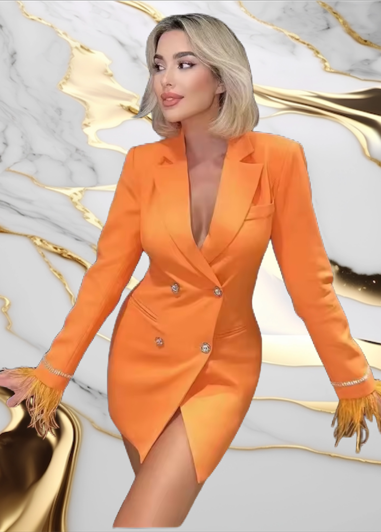 CARLY - Open Back Breasted Button Cuff Feather Blazer Dress
